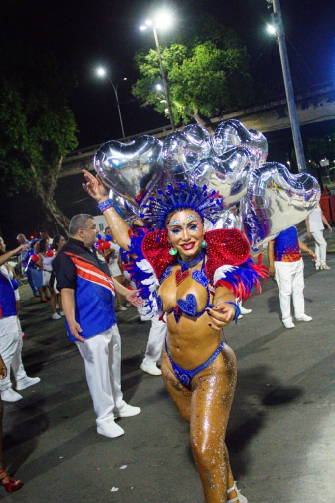 Criativa e alinhada ao enredo, Amanda chamou atenção pelo figurino escolhido para o ensaio. A fantasia, intitulada “Coração Insulano”, trouxe balões de gás hélio em formato de coração e fez referência direta a um verso do samba-enredo da escola, traduzindo em imagem a emoção e a identidade presentes na obra carnavalesca.